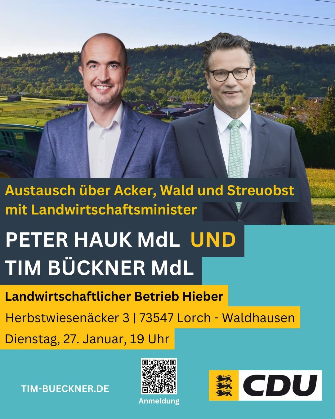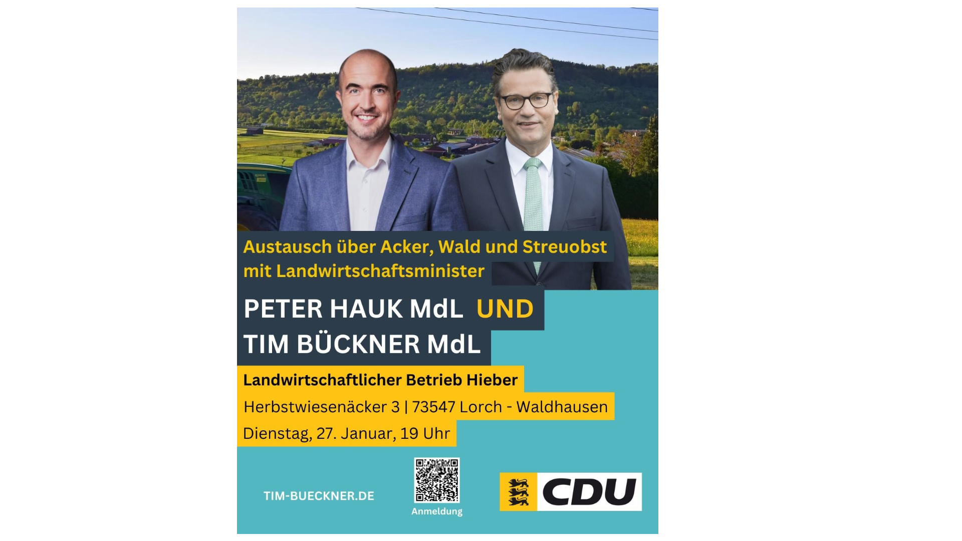mehrLand- und Forstwirtschaft und unsere Streuobstwiesen sind nicht nur ein wesentlicher Teil unserer wunderbaren Kulturlandschaft, sie sind auch ein gewichtiger Wirtschaftsfaktor und Nahversorger.Vor welchen Herausforderungen die Agrarwirtschaft steht und welche Lösungen wir hierfür haben möchten wir mit Ihnen und Euch, gemeinsam mit unserem CDU-Abgeordneten Tim Bückner MdL und mit Landwirtschaftsminister Peter Hauk MdL diskutieren.Eine Anmeldung über den QR Code oder formlos an felix.schneider@cdu-ostalb.de hilft uns bei der Planung.